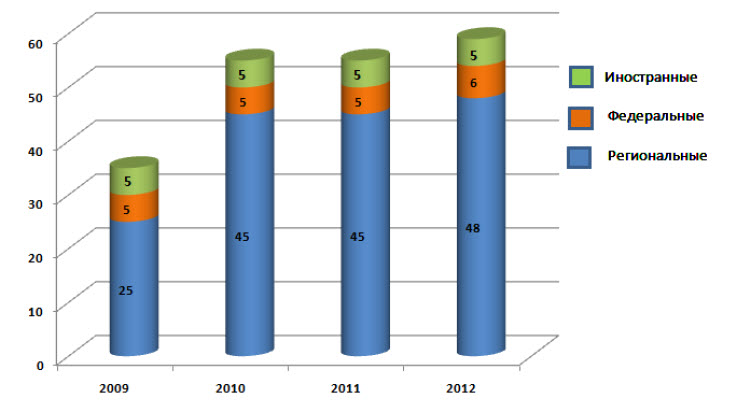 Структура соотношения иностранное / федеральное / региональное агентство практически не изменилась, вышло на рынок одно федеральное агентство. График представлен ниже.