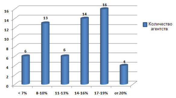Чуть больше половины рекрутинговых компаний работает в сегменте 14-19 %. В числе этих компаний некоторые федеральные агентства, представительства иностранных агентств, все агентства АРАУ, а также